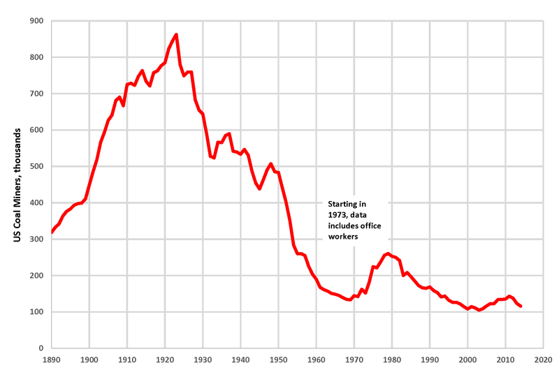 But in no way do the number of employed people reflect the output of the coal industry. During that same period the annual production of coal almost doubled. Putting those numbers* in relation gives you an idea about the impact of technology on the coal industry: