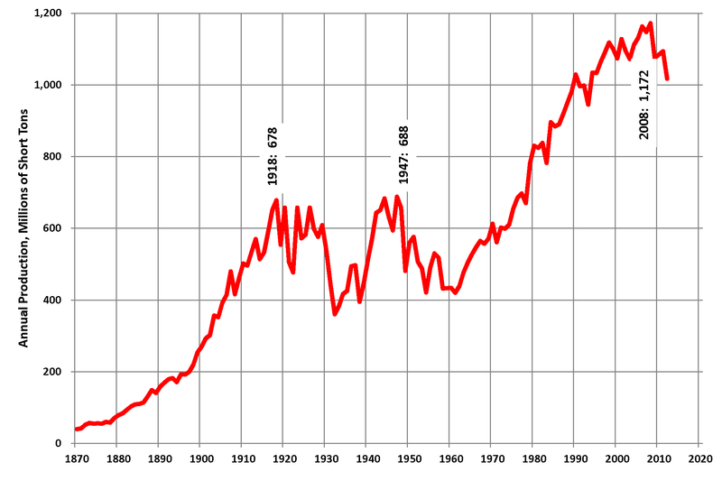 - 1920: 600 million tons / 800,000 workers = 750 tons per worker